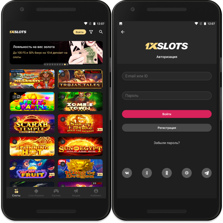 После завершения установки нажмите на иконку 1xSlots на домашнем экране вашего устройства и авторизуйтесь или создайте новую учетную запись, чтобы начать играть.